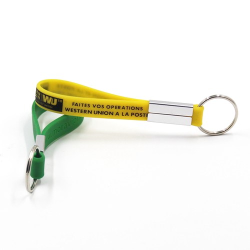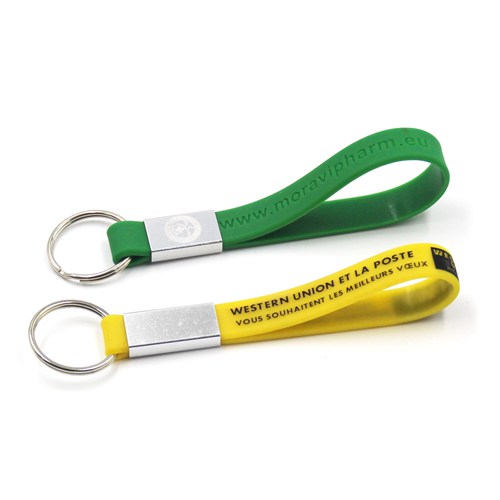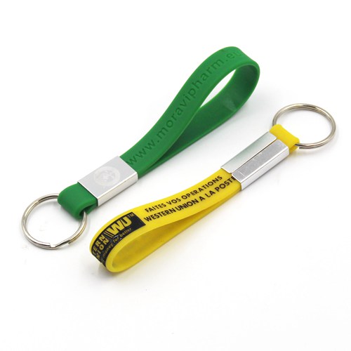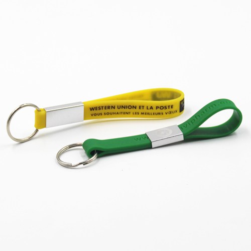 Adjustable silicone wristbands keychians are with a sliding clip, you can control the length of keychain easily. For this keychain, you can choose debossed or printing style, but not embossed.