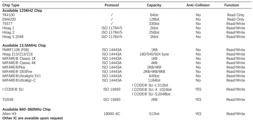 Frequency: 13.56mhz, 860-960mhz, 125khz are available