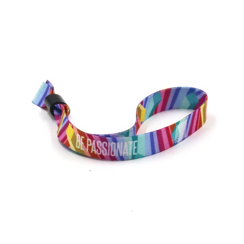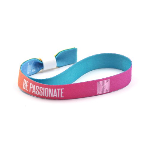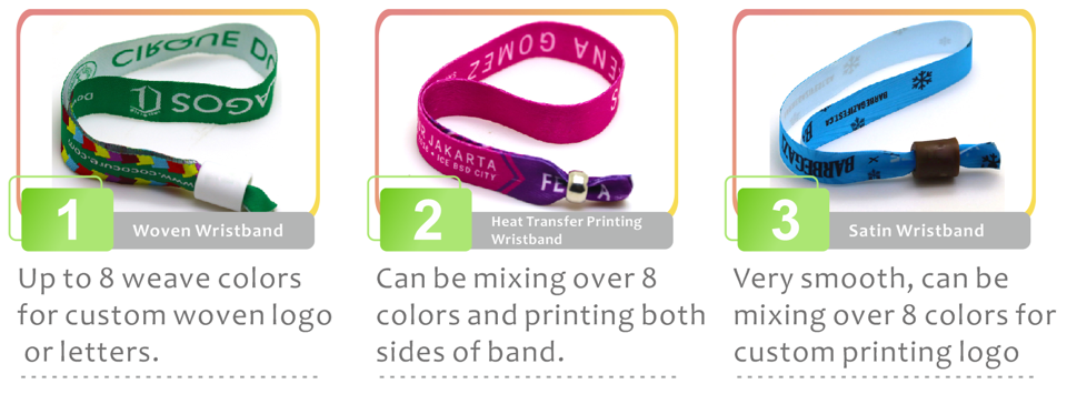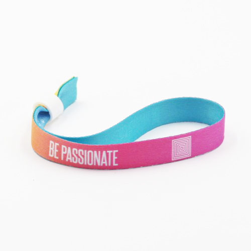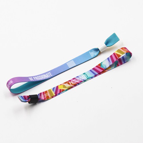 Sublimation-printed fabric wristbands allow you to choose any Pantone card number, giving you the ability to get really creative. And you can choose to print on one side or both sides. Different to woven wristbands, logo with gradient color also available. So, if you want fast delivery and wonderful color, sublimation-printed fabric wristbands will be your best choice.
